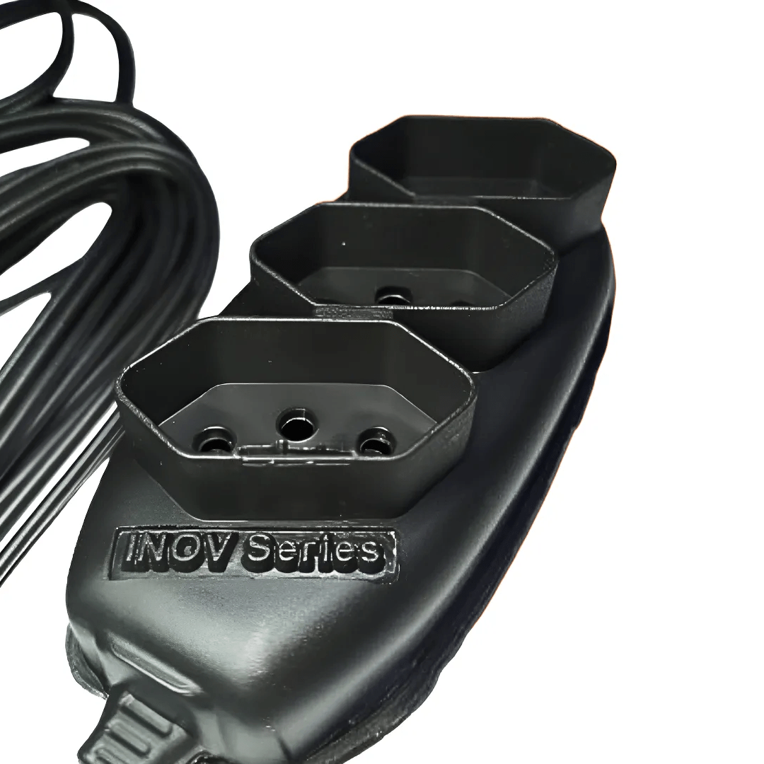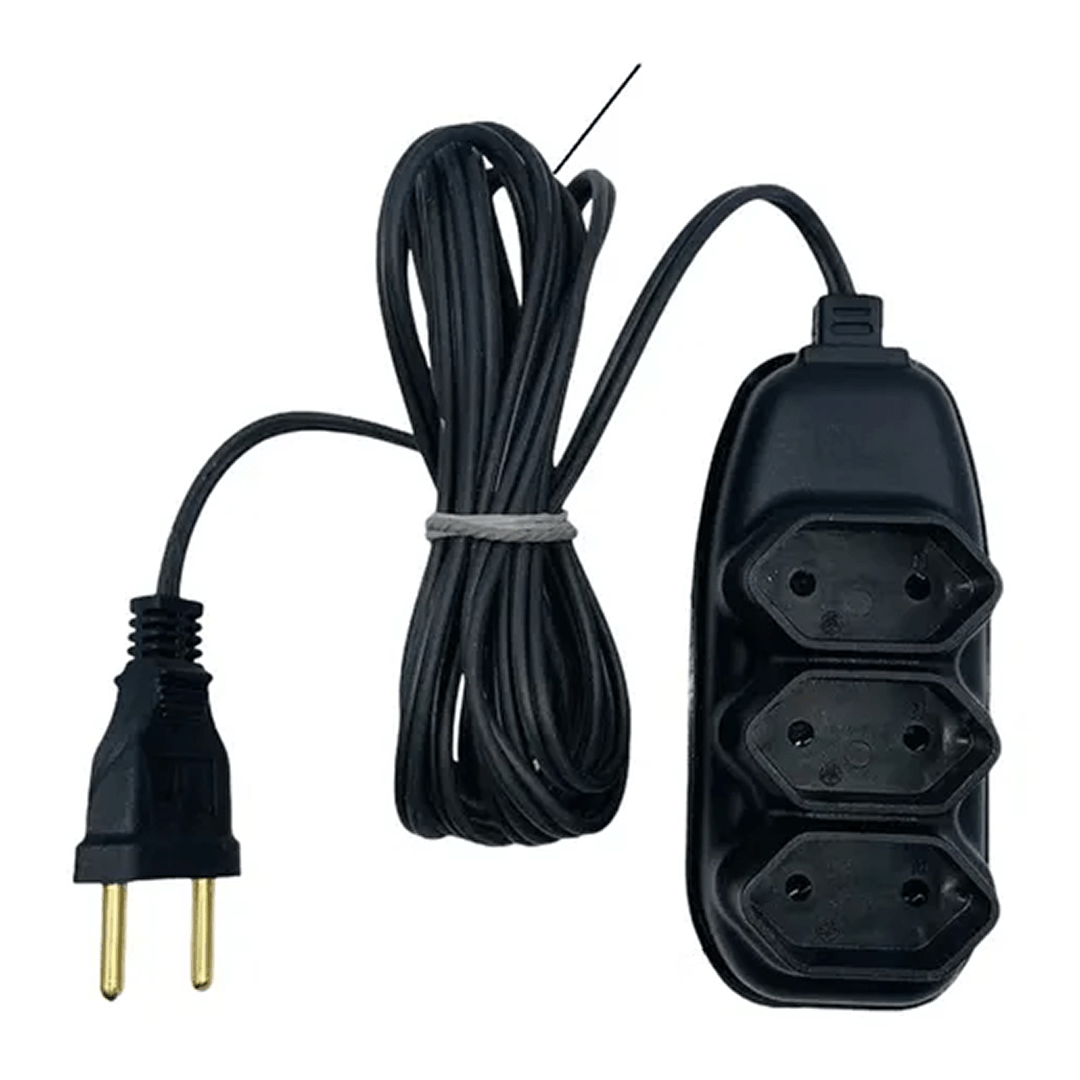 Extensão elétrica Inov com 5 metros de comprimento, compatível com redes 127V e 220V. Possui 3 entradas para plugues de 3 pinos (padrão brasileiro), permitindo conectar até três aparelhos simultaneamente. O plugue macho é de 2 pinos, garantindo compatibilidade com a maioria das tomadas residenciais. Prática, resistente e ideal para uso diário.