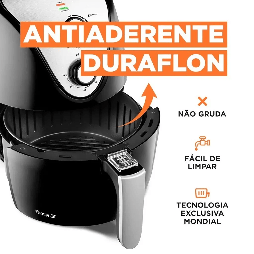 A Fritadeira Elétrica Sem Óleo Air Fryer Family-IV, tem um design todo sofisticado! Perfeito para aquele almoção de família ou para a reunião da turma, pois tem o tamanho ideal com capacidade de 3,5L. Você pode fritar seus alimentos preferidos com muita qualidade, sem usar óleo, sem fazer sujeira, sem deixar fumaça pela casa. Pão de queijo, pastel, doces, carnes, legumes e outros pratos ficam prontos em minutos e servem toda a sua família.