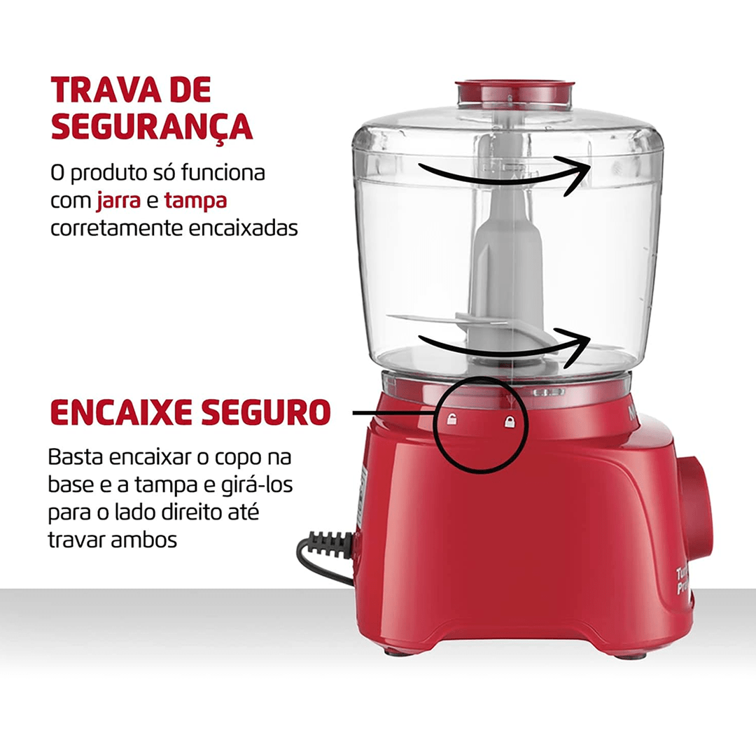 TRAVA DE SEGURANÇA: O produto só funciona com jarra e tampa corretamente encaixados. O travamento é pela lateral: basta encaixar o copo na base e girá-lo para o lado direito.