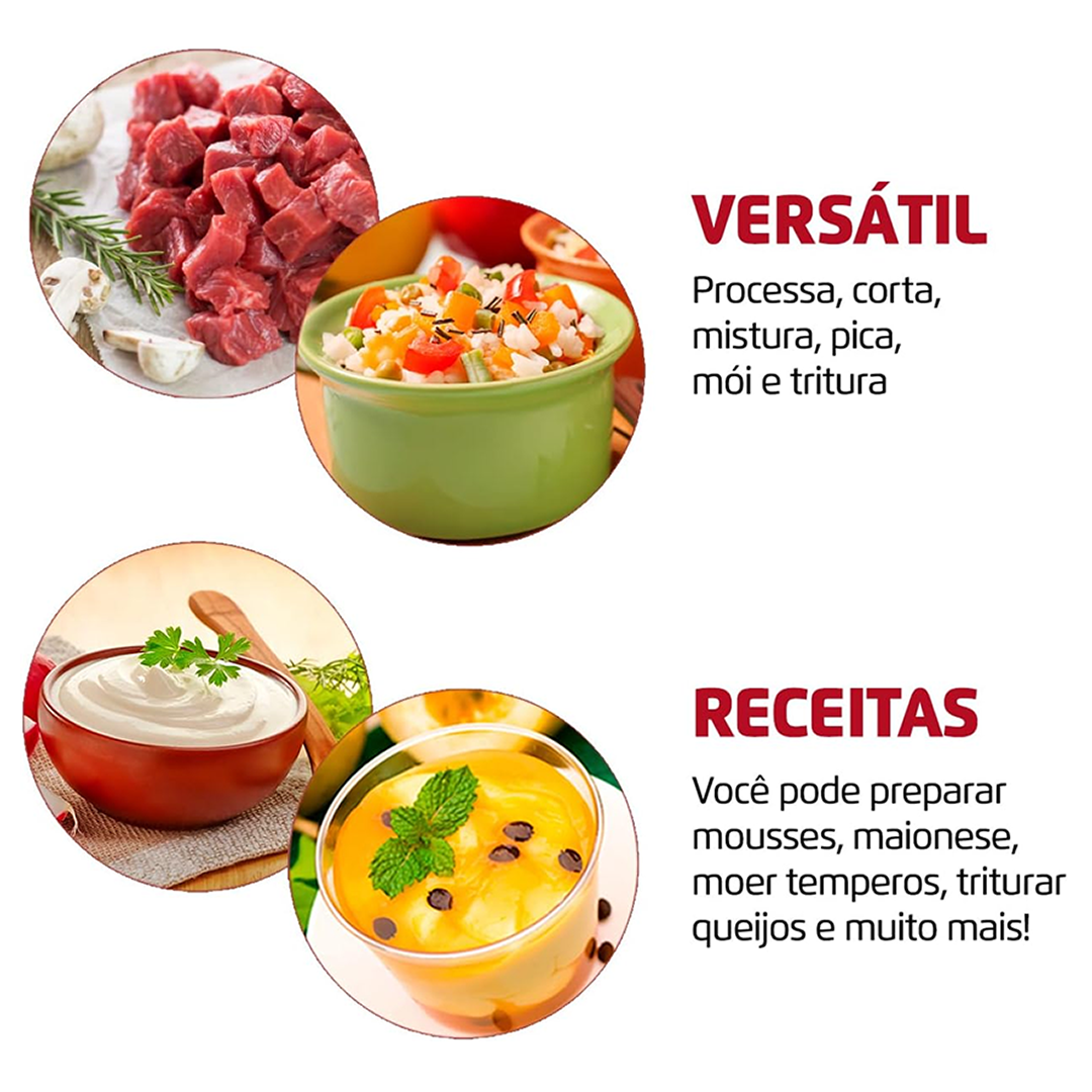 - VERSATILIDADE DE RECEITAS: Processa, corta, mistura, pica, mói e tritura. Você pode preparar mousses, maionese, moer temperos, triturar queijos e muito mais.